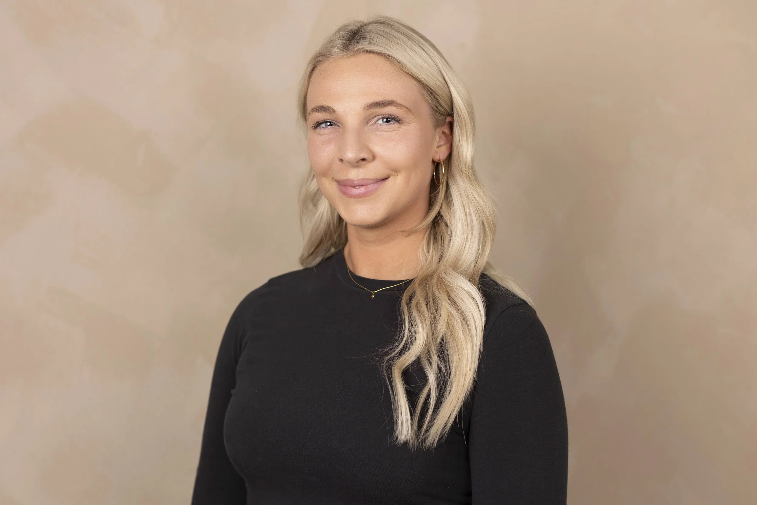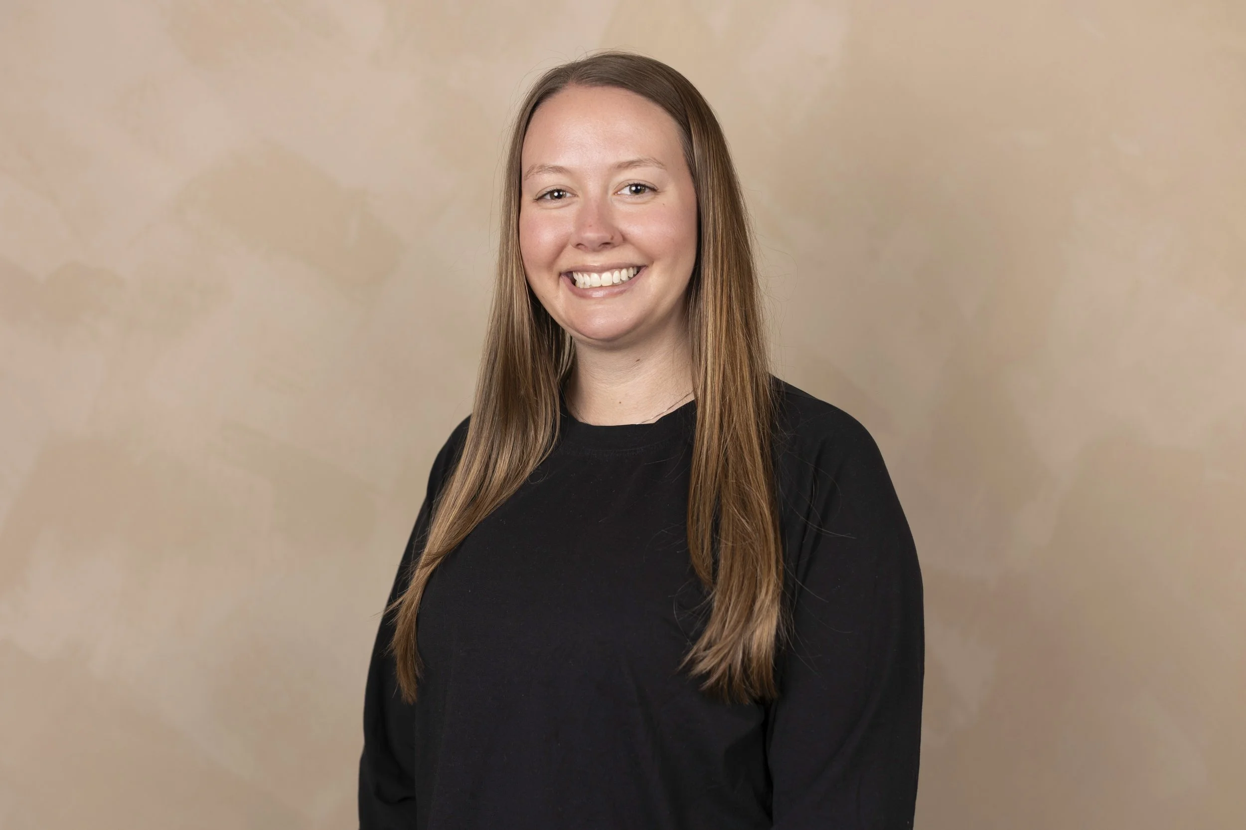 A young woman with long, straight, light brown hair, smiling, wearing a black long-sleeve top, standing against a neutral beige background.