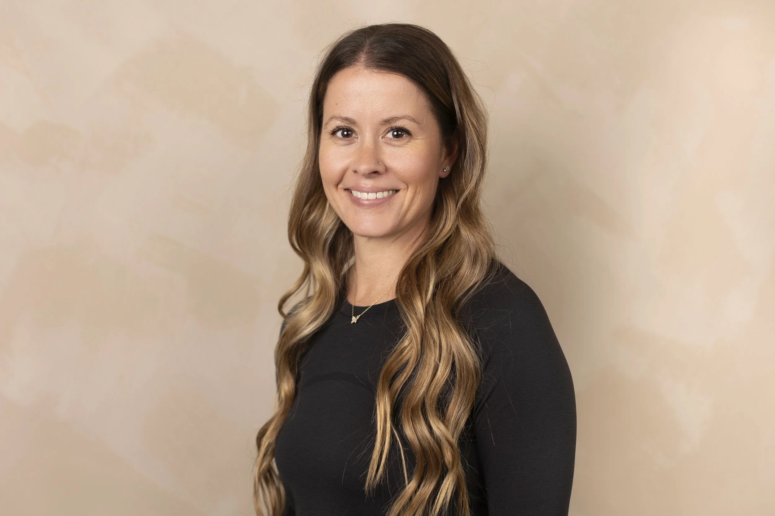 A woman with long wavy brown hair smiling and wearing a black top against a light beige background.