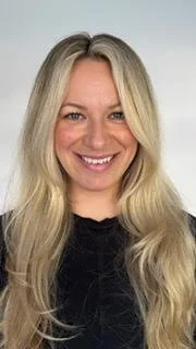 A smiling woman with long blonde hair wearing a black top, facing forward against a plain background.