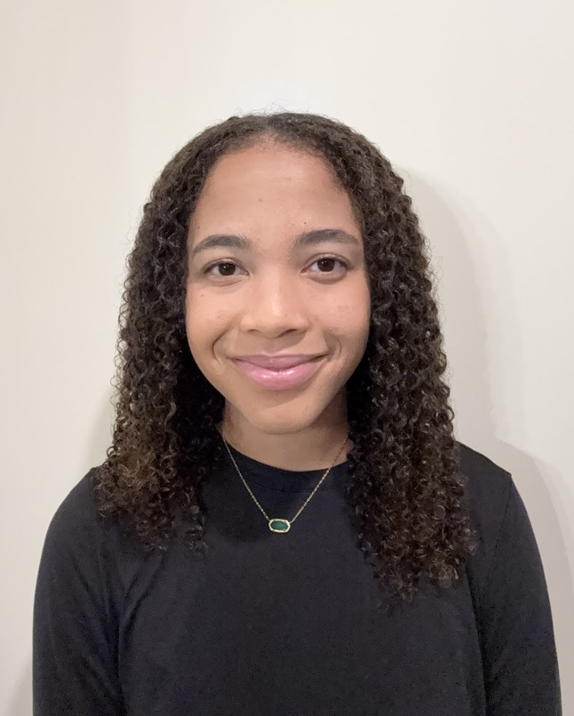 A young woman with shoulder-length, wavy brown hair and a black top, smiling softly against a white background.