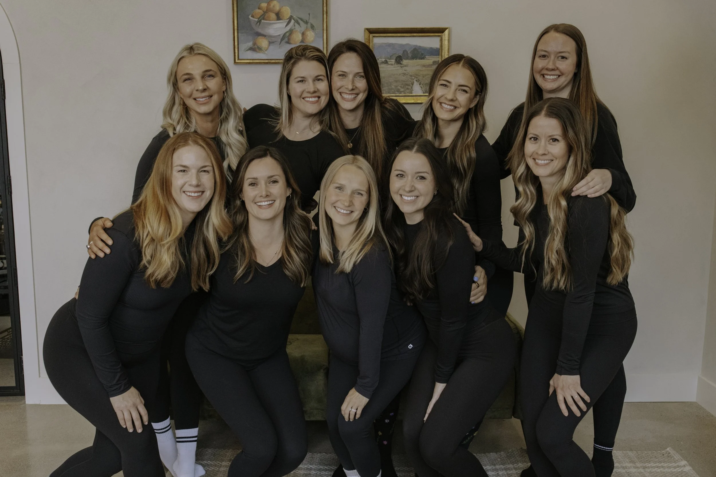 Ten women dressed in black posing together in a living room with artwork on the wall behind them.